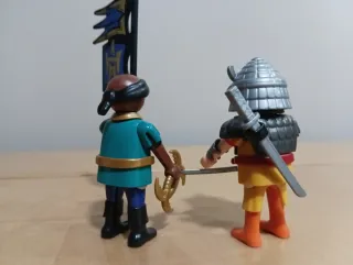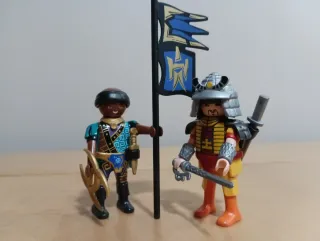 Set de dos figuras de Playmobil representando guerreros samuráis, acompañados de una bandera. Guerreros asiáticos - Un guerrero viste armadura plateada y traje amarillo y rojo, porta una espada. - El otro guerrero tiene turbante negro, traje azul y dorado, y un escudo. - Incluye una bandera con diseño azul y dorado. Opción de agrupar anuncios y de realizar envíos ordinarios por Correos