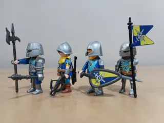 Conjunto de 4 figuras de guerreros de Playmobil de la serie Novelmore. Incluye accesorios. - Figuras con armadura y cascos. - Accesorios como espadas, escudo, ballesta y bandera. - Diseños detallados de temática medieval. Opción de agrupar anuncios y de realizar envíos ordinarios por Correos