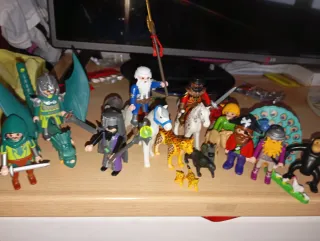 Conjunto variado de figuras y accesorios de Playmobil, ideal para coleccionistas y aficionados. - Incluye figuras de caballeros, magos y piratas. - Diversos animales como caballos y leopardos. - Accesorios como espadas, lanzas y escudos. - Elementos temáticos como un dragón y un abanico de pavo real.