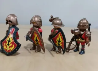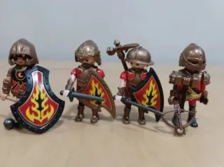 Set de 4 figuras de caballeros de Playmobil de la serie Novelmore. - Figuras con armadura y cascos de color bronce. - Incluyen escudos con diseño de llamas. - Accesorios como espadas y ballesta. Opción de agrupar anuncios y de realizar envíos ordinarios por Correos
