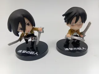 7 figuras coleccionables de Attack on Titan. - Diseño estilo chibi. - Personajes con espadas. - Bases negras con texto. - 1 Ilustracion de tela de la serie