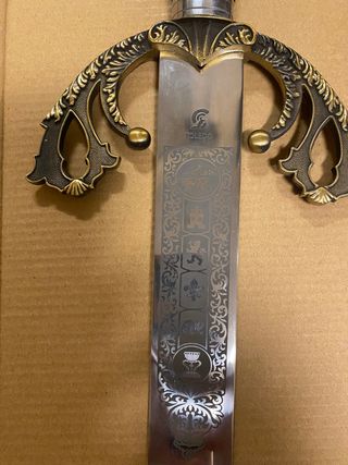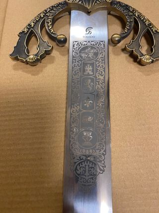 Espada Toledo en perfectas condiciones. Esta sin entrenar. Espada plateada con detalles dorados y cobres. Tiene grabado en ambas caras.