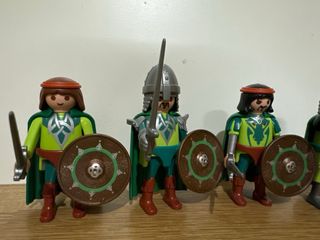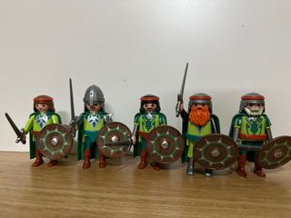 Conjunto de figuras de Playmobil de vikingos. - Incluye 5 figuras. - Cada figura lleva un escudo y una espada. - Diseños detallados en la vestimenta y accesorios.
