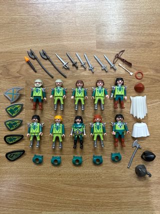 Lote de 6 figuras de Playmobil inspiradas en los elfos de El Señor de los Anillos. Perfectas para coleccionistas y fans de la saga. - Figuras de elfos guerreros. - Incluyen arcos y espadas. - Cascos plateados y armaduras detalladas. - Capas verdes.