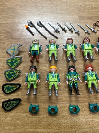 Set de figuras Playmobil de guerreros con temática de dragón verde. Incluye varios personajes y accesorios. - Figuras de guerreros. - Accesorios variados como espadas, escudos y antorchas. - Temática de dragón verde.