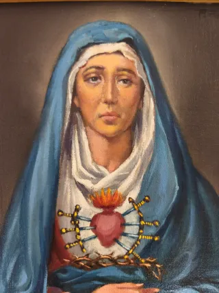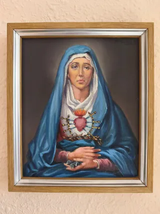 Preciosoa pintura al óleo sobre tabla de Nuestra Señora de los Dolores. Obra de arte religiosa. Firmada por el madrileño Francisco Postigo. Medidas de la tabla: 19'5 x 23 cm. Medidas del marco: 21'8 x 25'3 cm. La pintura original se llama ahora NUESTRA SEÑORA de QUITO y se encuentra en Quito, ECUADOR. Data de los primeros evangelizadores españoles que llegaron allí, en 1534. Representación de la Virgen Dolorosa. Siete espadas atraviesan su corazón. Corona de espinas. En sus manos sostiene los clavos de Jesús. Está impecable. Es una virgen preciosa. Las fotos forman parte de la descripción del artículo Te lo enseño sin compromiso
