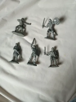 Conjunto de cuatro figuras de soldados de plástico, con espadas y escudos. - Figuras de estilo antiguo. - Detalle de armaduras y vestimenta. - Incluye espadas y escudos.