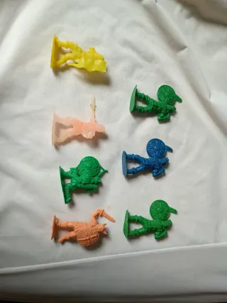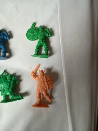 Conjunto de figuras de plástico de guerreros vikingos. - Figuras de diferentes colores: amarillo, rosa, verde y azul. - Cada figura está sobre una base. - Algunas figuras portan escudos y espadas.