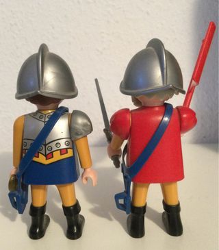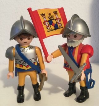 Dos figuras de Playmobil representando soldados españoles con una bandera. - Figuras con cascos plateados. - Uno porta una espada y el otro sostiene la bandera. - La bandera tiene el escudo de España.