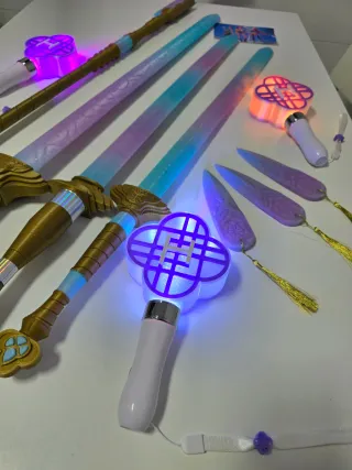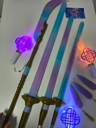 Espadas y accesorios luminosos inspirados en Huntrix Rumi Mira Zoey. Incluye varios elementos decorativos y de ambientación. - Espadas con diseño degradado en morado y azul. - Varitas luminosas con símbolo. - Adornos adicionales con borlas. - Realizada en impresión 3D de alta calidad - Espada Rumi adulto 109cm 60€ - Espada Rumi niña 85cm 40€ - Espada con borla Rumi niña 91cm 40€ - Dagas Zoey x3 Unidades 15cm 20€ - Espada grande Mira adulto 135cm 80€ - Ligth Sticts Logo Huntrix con luz 15€
