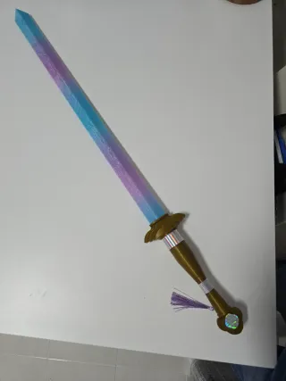 Espada decorativa con un diseño llamativo, ideal para juegos o disfraces. - Hoja con degradado de azul a morado. - Empuñadura dorada con detalles. - Guarda y pomo ornamentados.