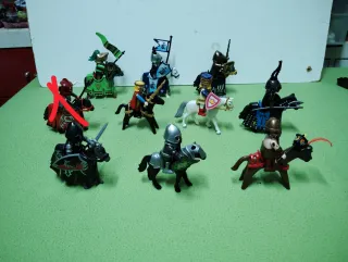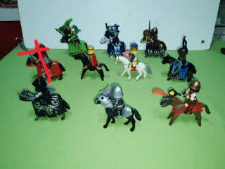 Precio x unidad Fila atrás a 12€ unidad Fila del medio a 10€ unidad Fila alante a 9€ unidad Conjunto de figuras Playmobil de caballeros medievales a caballo. - Figuras de caballeros con armadura. - Caballos de diferentes colores. - Accesorios de combate como espadas y lanzas.