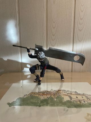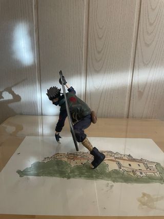 Figura de anime detallada de Kakashi con su icónica espada 15cm de alto y 26cm de ancho - Diseño dinámico y pose de acción. - Pintura con detalles de desgaste en la espada.