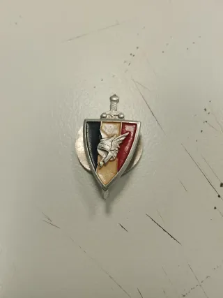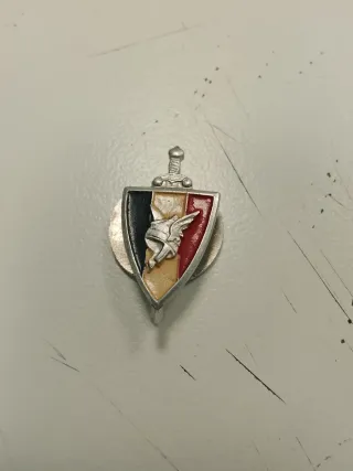 Pin de solapa con diseño de escudo y espada. - Colores: negro, blanco y rojo. - Detalle de casco con alas y figura central.