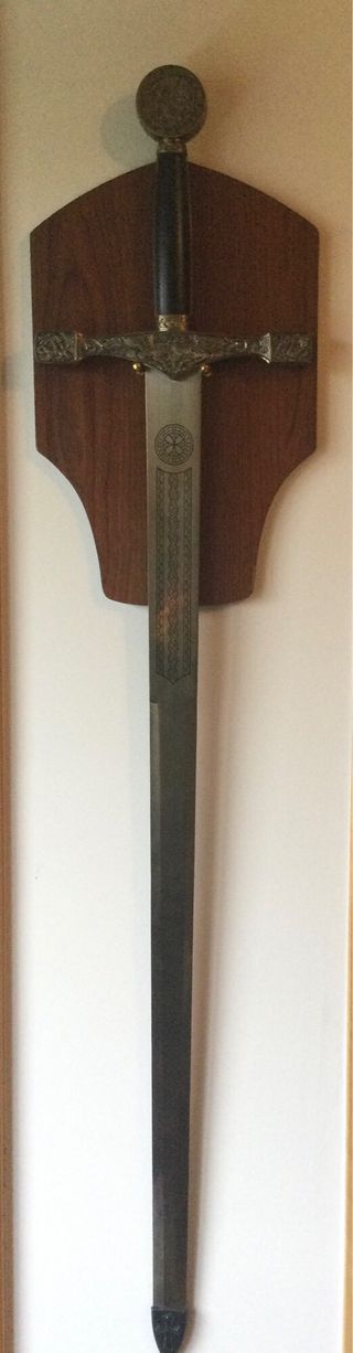 Réplica decorativa de la espada Excalibur, ideal para coleccionistas o como elemento de exhibición. - Hoja metálica con grabados. - Empuñadura detallada. - Incluye soporte de madera para pared.