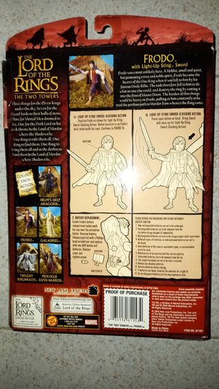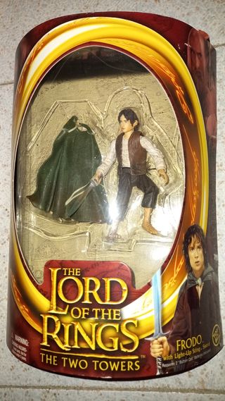 Figura de Frodo con espada luminosa de Toy Biz de la película de El Señor de los Anillos (The Lord Of The Rings) correspondiente a la parte de Las Dos Torres (The Two Towers). Funciona con pilas. Nueva sin abrir.