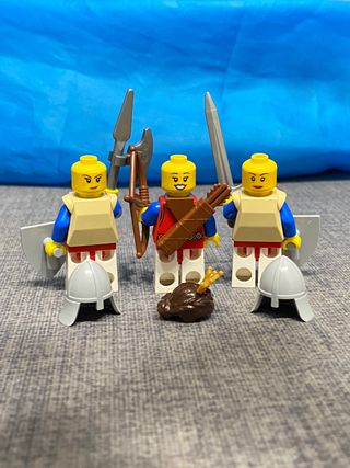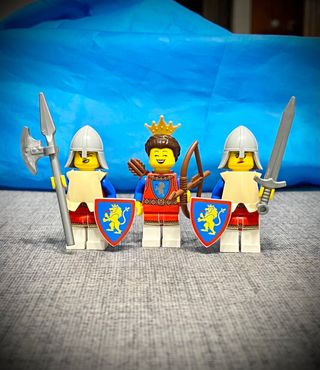 Princesa / reina y dos soldados mujer. Princesa: Corona en cabeza con pelo recojido, torso león, piernas conjunto femenino, porta flechas y arco. Guardia: Casco gris claro pulido con protector cuello, torso león, piernas conjunto femenino, coraza color tan, Lanza - hacha, espada larga y escudo león. Hago envíos y packs. Opciones de entrega en Barcelona, Sant cugat-Terrassa.