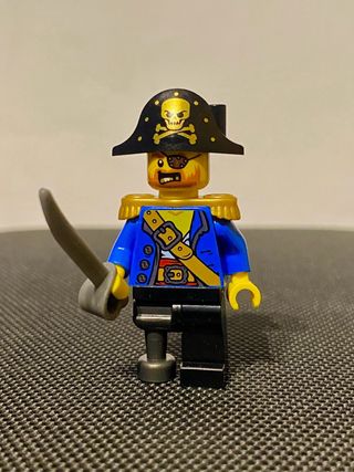 Hago packs, envio y descuento por cantidades. Sombrero pirata con calabera dorada, cara con parche en ojo, barba pelirroja, diente de oro, hombreras doradas, torso con casaca azul, camira rota, faja con cinturón, piernas con para palo metal oscuro. Espada