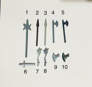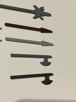 Precio unidad. Descuentos por cantidades. Hago packs y envios. 1. Lanza larga con cuchillas 1u. 0’9€ VENDIDA 2. lanza marrón 4u. 0’5€ 3. Lanza gris claro perlado 1u. 0,5€ 4. Hacha gris 5u. 0’5€ 5. Hacha Gris oscuro perlado 4u. 0,5€ 6. Espada medieval 20u 0,5€ 7. Maza gris claro perlado 5u. 0,4€ 8. Maza plata 5u. 0,4€ 9. Cuchilla hacha plata 11u. 0’5€ 10. Cuchilla hacha Gris oscuro perlado 7u. 0’5€