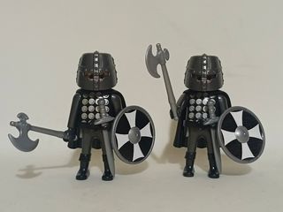 Playmobil dos clicks medievales, caballero de traje negro, con capa negra. Lleva casco, escudo, capa, cinturón, espada, hacha. Para temática medieval, templarios, orden del temple, cruzadas, teutónicos. Puedes comprar una figura por 4€ O las dos por 7,5€ Para comprar escribir antes para darte información de condiciones de envío. Se agrupan artículos y posibilidad de recoger o de envío ordinario.