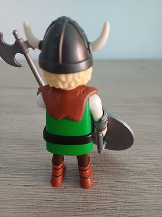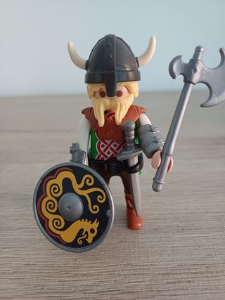 Figura Playmobil de un vikingo. Es una figura genial para coleccionistas o para jugar. - Incluye un hacha, una espada y un escudo. - El escudo tiene un diseño de dragón. - Lleva un casco con cuernos. - La figura está en buen estado.