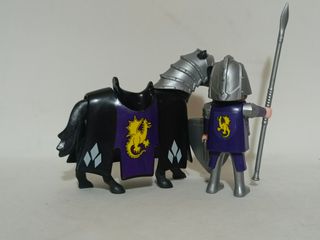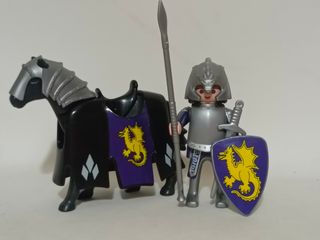 Caballero Playmobil medieval con armadura plateada, yelmo con dragón y escudo con dragón dorado. Incluye lanza y espada. El caballo lleva armadura y una guardrapa con detalles un la insignia. ¡Un set genial para los amantes de Playmobil! - Incluye caballero, caballo y accesorios. - Figuras en perfecto estado. - Perfecto para coleccionistas o para jugar.