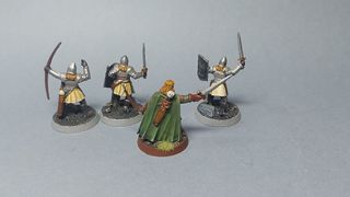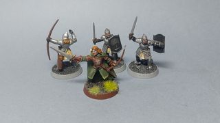 Figuras de Faramir y tres soldados veteranos de Osgiliath de El Señor de los Anillos. - Faramir con arco (el brazo NO es el original, pero apenas se nota, es otra espada) -Tres soldados con espada y escudo.
