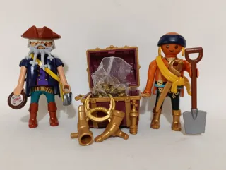 Set de Playmobil de piratas con un cofre lleno de tesoro. - Incluye dos figuras de piratas. - Cofre de tesoro con objetos color oro. - Accesorios como brújula, espadas y pala etc. En mi perfil más artículos playmobil, medieval, oeste, indios, caballeros, vikingos, soldados, pesebre, Belén, caganer, accesorios playmobil. Se hace envío ordinario Por wallapop o inpost. Posibilidad de recogida en zona.