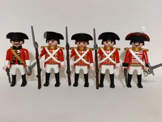 Conjunto de 5 figuras de Playmobil representando soldados ingleses de época. 3 soldados + 1 capitán + 1 sargento Soldados Coloniales, ingleses. - Uniformes rojos con detalles dorados. - Sombreros negros característicos. - Incluyen accesorios como rifles y espadas. En mi perfil más artículos playmobil, medieval, oeste, indios, caballeros, vikingos, soldados, pesebre, Belén, caganer, accesorios playmobil. Se hace envío ordinario Por wallapop o inpost. Posibilidad de recogida en zona.