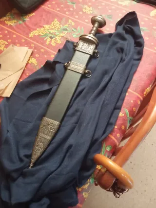 Réplica de espada gladius romana, inspirada en el diseño clásico. - Funda con detalles metálicos ornamentados. - Empuñadura con pomo y guarda decorados. - Diseño inspirado en la época romana. Negociable escucho ofertas. No hago envíos.