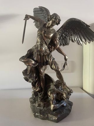 Estatua detallada del Arcángel San Miguel luchando contra el mal. - Material: Resina en bronce. - Representación dinámica del ángel con espada y demonio. - Base rocosa detallada. El ángel costó 300€, lo dejo en 200€.