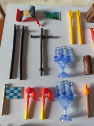 Lote de accesorios variados para Playmobil. Incluye espadas, escudos, linternas, palas y más. 0.5 unidad - Accesorios de diferentes colores y formas. - Piezas para crear escenarios y aventuras. - Ideal para coleccionistas y para completar figuras.