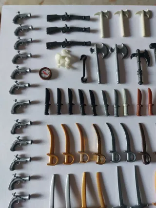 Lote de accesorios variados para Playmobil, ideal para completar tus escenarios. 0.5 unidad - Incluye pistolas, rifles y espadas. - Variedad de armas blancas y de fuego. - Piezas de colección.