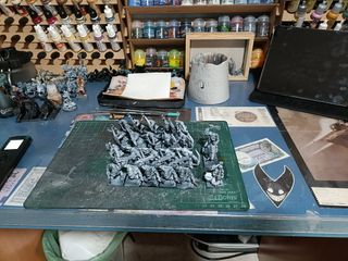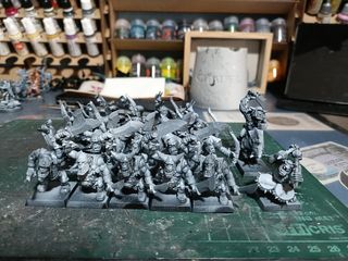 Orcos Warhammer fantasy, old world en peana cuadrada. 1 jinete orco jabalí. 1 músico orco con tambor. 20 orcos a pie (arco, espadas y arcos y espada) Solo imprimados en negro y blanco listos para pintar.
