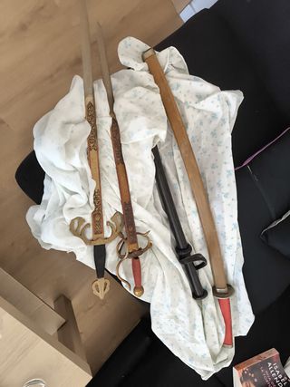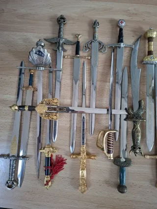 Dos espadasde figuas del Señor de los Anillos. Son réplicas detalladas de las armas icónicas de la saga. 5€ cada una - Diseño metálico con acabados realistas. - Ideales para coleccionistas o decoración temática.