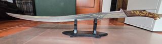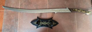 Réplica no oficial de la espada Hadhafang de El señor de los anillos, de metal, con soporte de madera, siempre en vitrina para exposición. Con alguna pequeña marca de desgaste del tiempo en la empuñadura