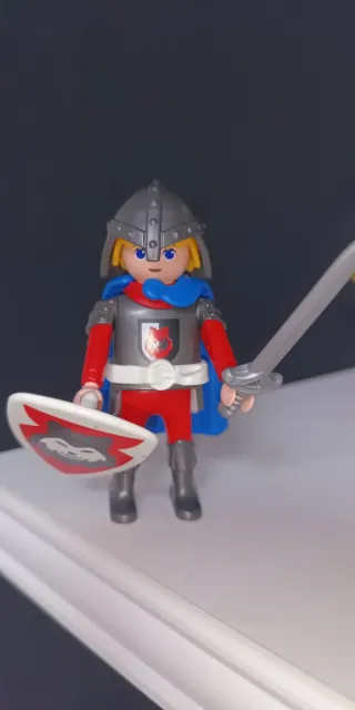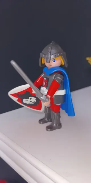 Figura de Playmobil de un caballero medieval. - Casco plateado con detalles. - Armadura gris con detalles rojos y azules. - Capa azul. - Escudo con diseño de lobo. - Espada plateada.