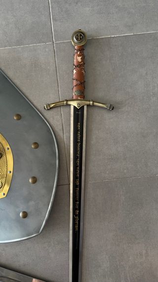 Conjunto de espada decorativa MARTO de Toledo y escudo. - Espada con empuñadura de cuero y detalles metálicos. - Hoja con inscripción. - Escudo metálico con remaches y detalles dorados.