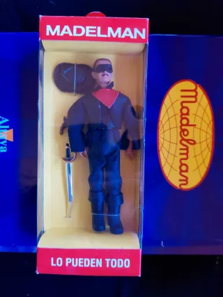 Figura clásica de Madelman, el Enmascarado, listo para la acción. - Incluye espada y sombrero. - Traje negro con pañuelo rojo. - Antifaz negro característico.