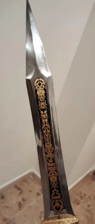 Réplica de la espada de Carlos V, elaborada en acero toledano. Presenta un diseño detallado con escudos y emblemas históricos. - Hoja de acero toledano. - Guarda con inscripciones y detalles dorados. - Empuñadura con detalles ornamentales.