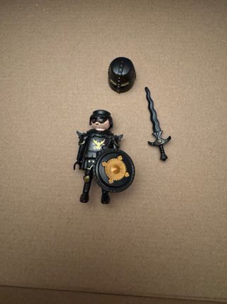 Figura de Playmobil Special, un caballero con armadura negra. - Incluye escudo dorado. - Espada y maza. - Casco con pluma morada.