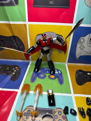 lote de figuras tipo Mazinger Z / Great Mazinger del año 2013, con un montón de accesorios intercambiables. Todo en muy buen estado, perfecto para coleccionistas. Incluye: • 2 figuras articuladas • Múltiples manos intercambiables (negras y plateadas) • Efectos de disparo y puñetazos con llama • Espada • Brazos extendidos • Cañones / piezas adicionales • Capa roja incluida • Todas las piezas visibles en las fotos Estado: ✔️ Muy buen estado general ✔️ Sin roturas ✔️ Articulaciones firmes ✔️ Accesorios completos según cinturón roto Entrega en mano en Málaga o en