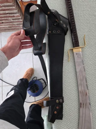 Espada decorativa con detalles ornamentales. - Empuñadura con adornos dorados. - Hoja de metal con filo serrado. - Funda de cuero con detalles metálicos.