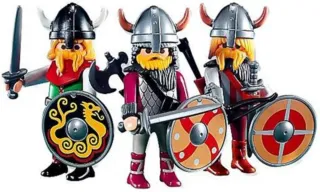 Set de figuras de Playmobil de vikingos. - Tres figuras de vikingos. - Incluye accesorios como espadas, hachas y escudos. - Diseños detallados en la armadura y vestimenta.