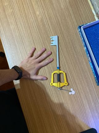 Réplica de la Llave Espada de Kingdom Hearts, con un tamaño de 30 cm. - Diseño inspirado en el videojuego. - Acabado metálico plateado en la hoja. - Empuñadura dorada con detalles. - Colgante de Mickey Mouse.