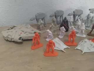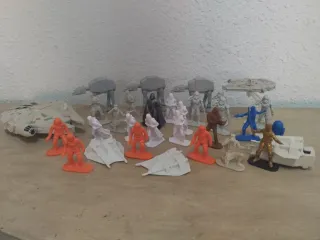 Colección de figuras y naves de Star Wars, incluyendo el icónico Millennium Falcon. - Figuras de personajes como Darth Vader y Stormtroopers. - Vehículos como AT-AT y naves TIE. - Piezas de plástico en varios colores. Sólo destacar la espada azul de Luke pegada
