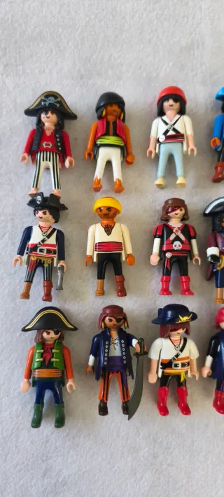 Conjunto de figuras de Playmobil de piratas. - Incluye 18 figuras de piratas. Incluido capitán pirata - Complementos como gorro pirata trabucos y espadas.b