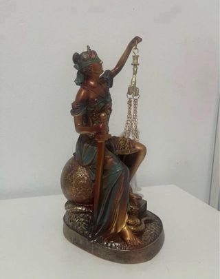 Estatua decorativa de la Diosa de la Justicia, también conocida como Temis. Viene sentanda sobre la luna. La diosa de la justicia en la mitología griega es Temis, quien se asocia más con la ley y el orden que con la luna, de la cual Artemisa (caza, luna) y Temis suele representarse con los atributos de la justicia: una balanza, una espada y una venda en los ojos. - Tiene 25 cm de alto. - Representación clásica con balanza y espada. - Detalle de serpiente en la base. - Acabado en color bronce y verde. - Kira Bali hace envíos a toda España... más artesanía y decoración en mi perfil....