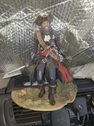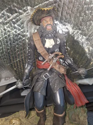 Figura de colección inspirada en el legendario pirata Barbanegra. Detallada y con una base temática. - Figura de pirata con vestimenta detallada. - Incluye espadas y pistolas. - Base con elementos de tesoro y calavera.