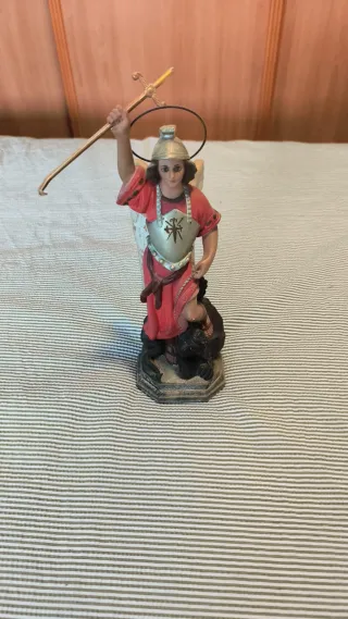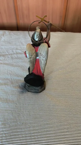 Figura religiosa de San Miguel Arcángel de 32 cm de altura. Representa al arcángel con armadura y espada, pisando a un demonio. - Material: Resina pintada. - Detalles: Halo metálico, armadura plateada, túnica roja y base decorada.